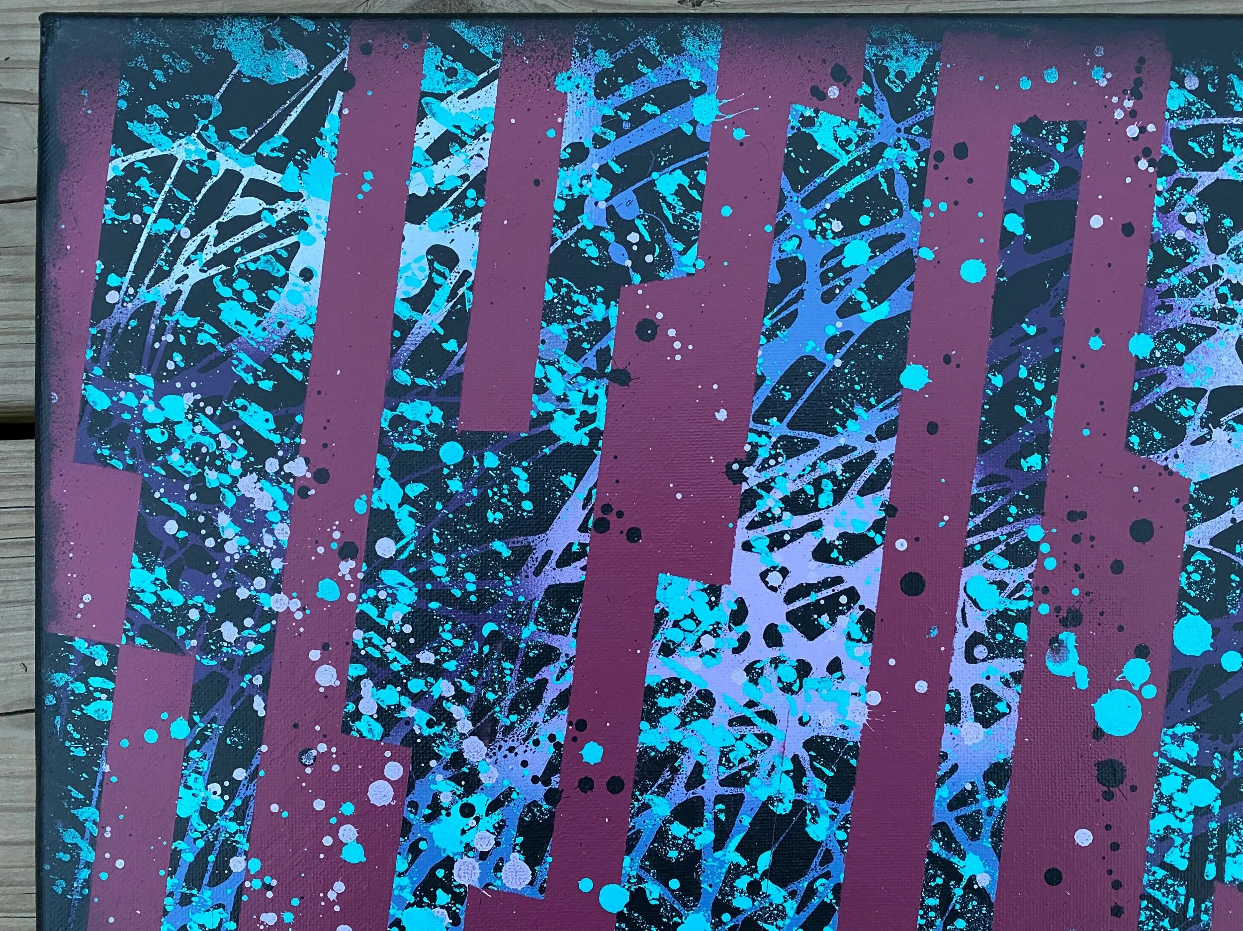 Multi-layered piece with galaxy feels creates for multi-dimension. Contrasting colors brings this piece to life - though few colors in the same family, they speak different languages. A bold piece with no apologies. Black, purple, turquoise, lavender, burgundy.